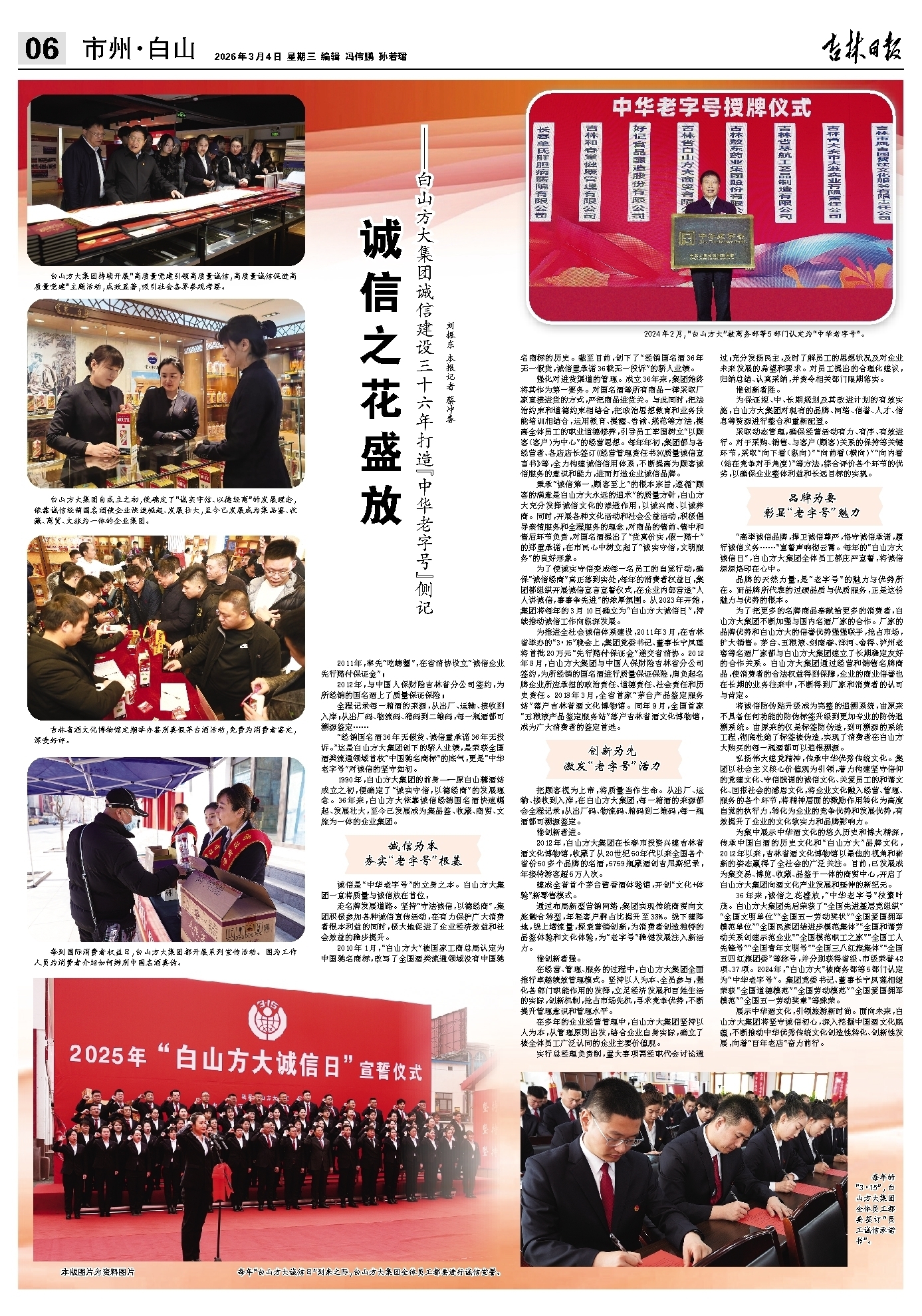诚信是“中华老字号”的立身之本。白山方大集团一直将质量与诚信放在首位,